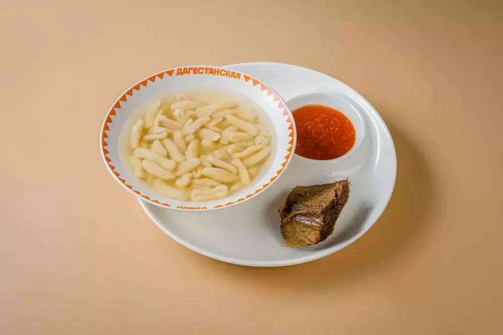 Маленькие галушки из пресного теста, подаются в наваристом говяжьем бульоне с мясом и соусом на выбор. Общий вес – 550 г