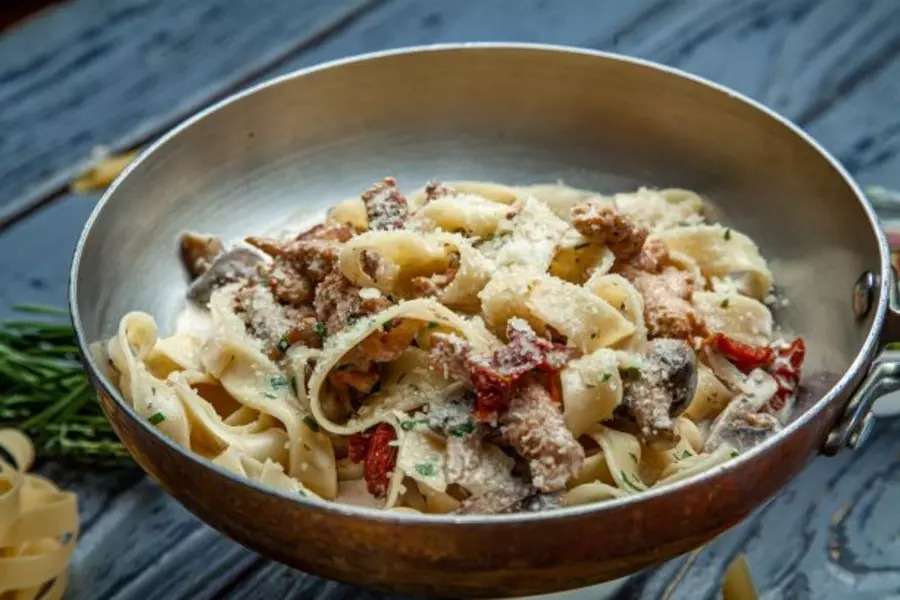 Сливки, паста фетучини, курица маринованная (курица, майонез, соус соевый, специя паприка), бульон куриный (вода питьевая, курица, лук репчатый, морковь), грибы шампиньоны, томаты вяленые, сыр пармезан, масло чесночное (масло подсолнечное, чеснок свежий), чеснок свежий, соль, зелень петрушки.